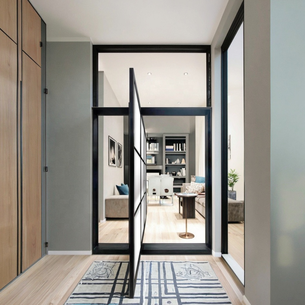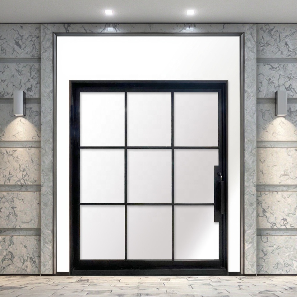 Luxury Modern Square Pattern Wrought Iron Swing Style Fiberglass Glass Pivot Doors European-Style Interior Wrought Iron